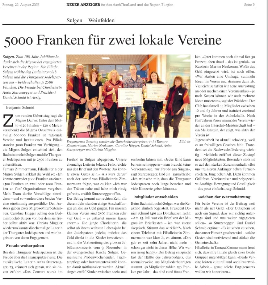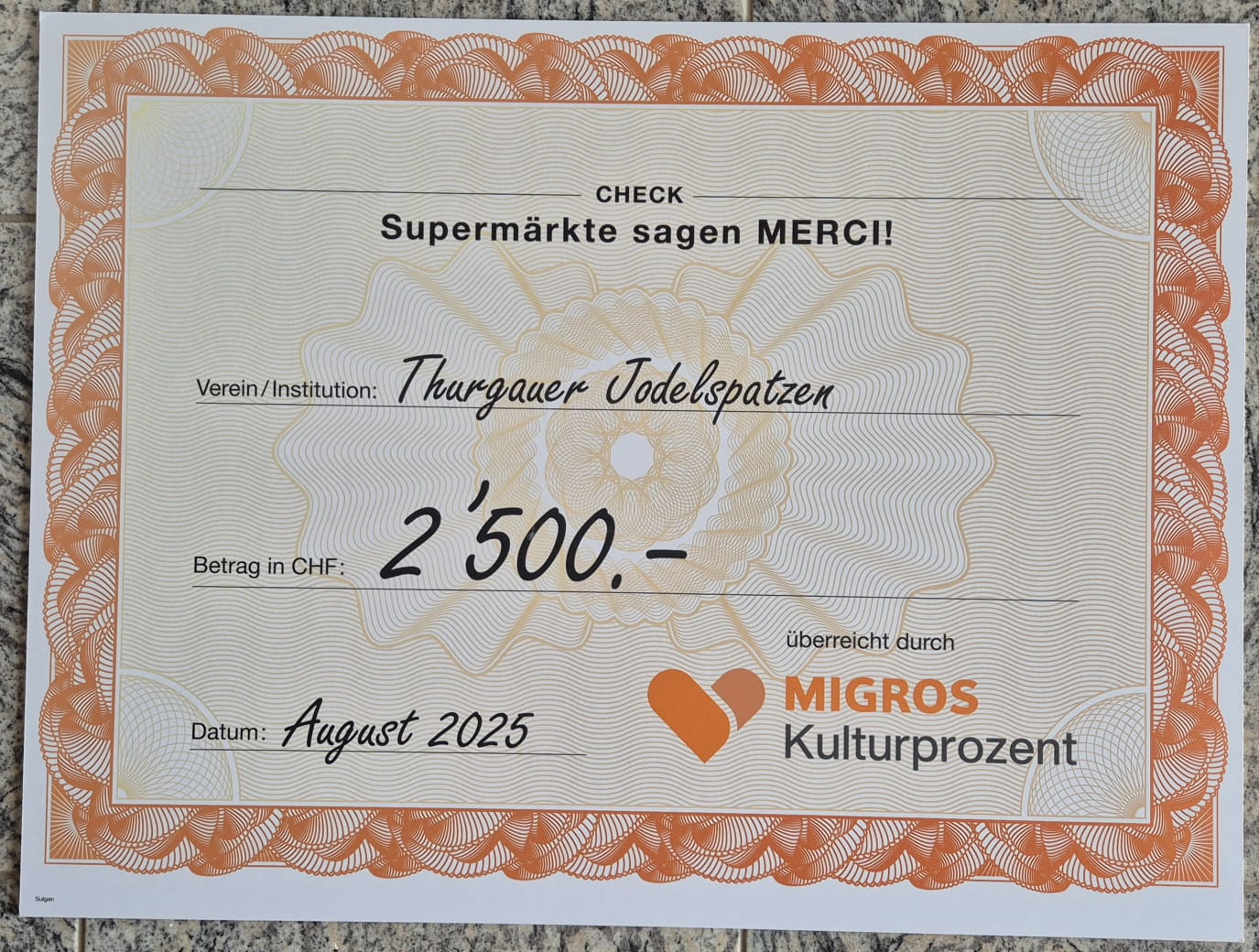Als einmaliges Dankeschön für das Engagement in der Region Sulgen, erhielten die Thurgauer Jodelspatzen Fr. 2500.-- aus dem Migros Kulturprozent-Topf.